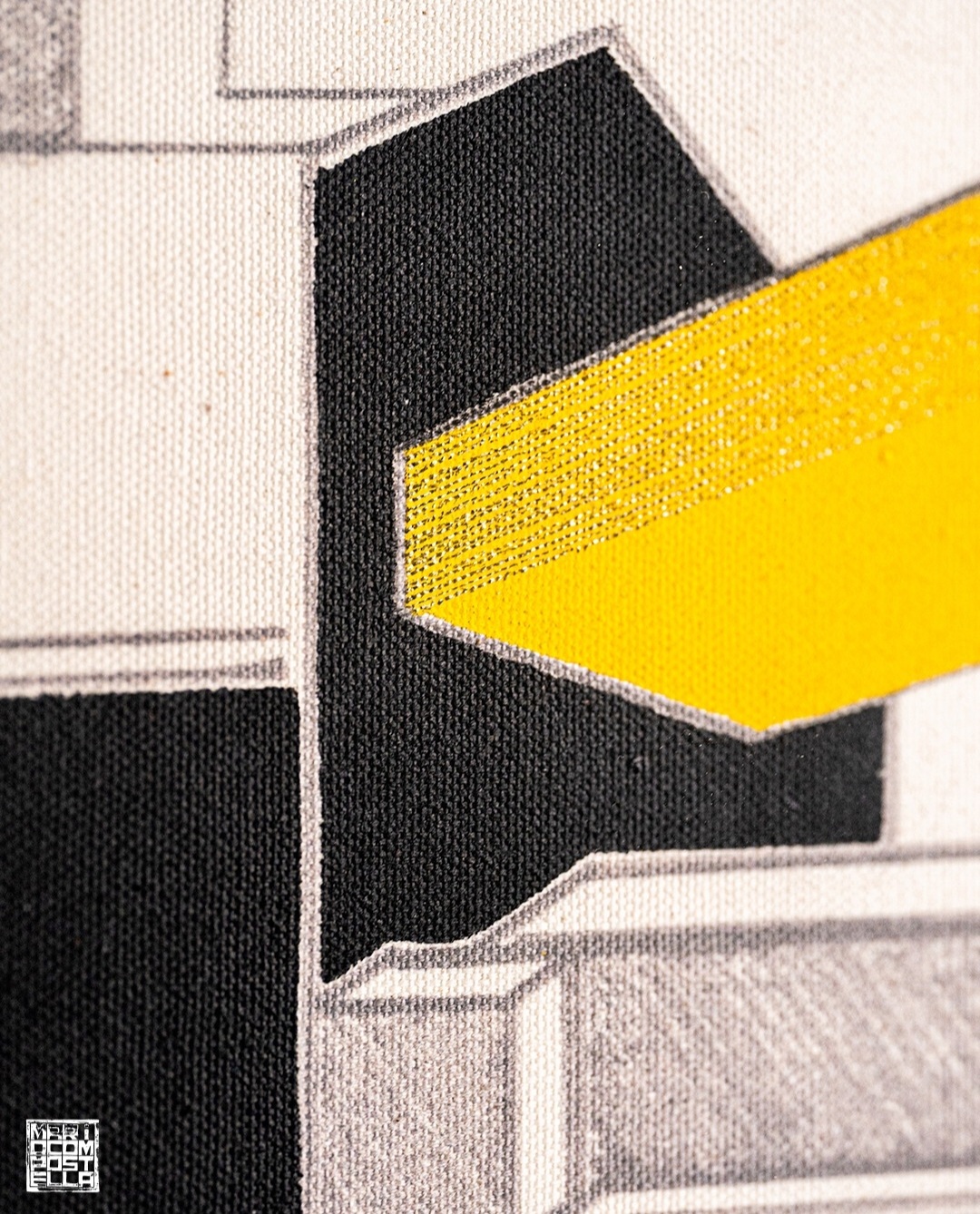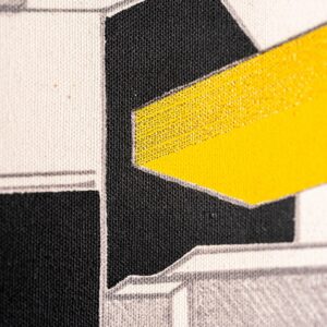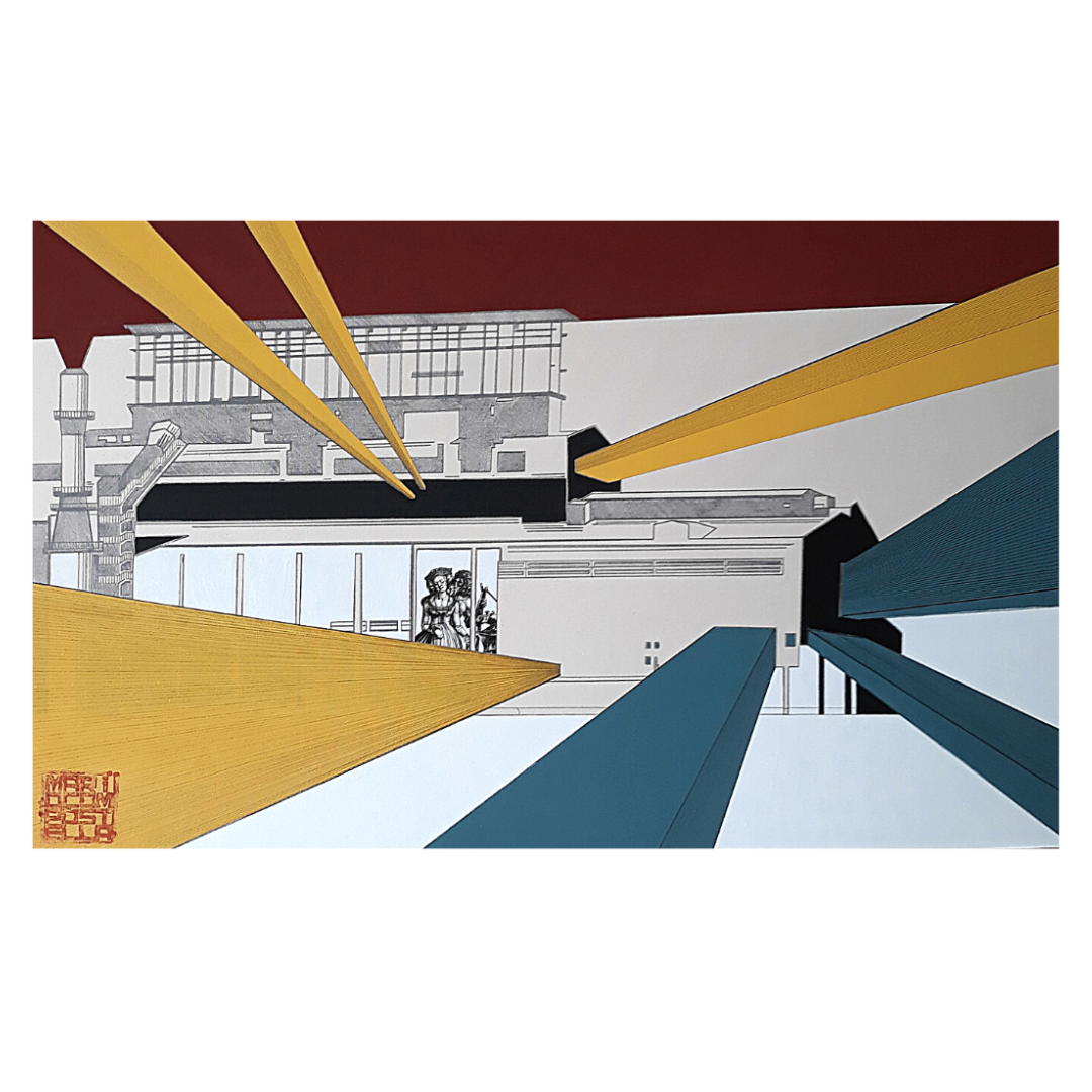 “Acciaieria” appartiene al progetto “URBAN” del 2021, una trilogia che mira a reinterpretare edifici industriali abbandonati. Sulla tela è stampato un disegno dell’acciaieria, vivacizzato da raggi colorati che emergono dalle aperture del capannone. L’opera include un camino riattivato visivamente, elementi decorativi ispirati all’incisore Albrecht Dürer e linee che omaggiano le teorie dei colori di Johann Wolfgang von Goethe. Il tutto è racchiuso da una cornice in metallo.