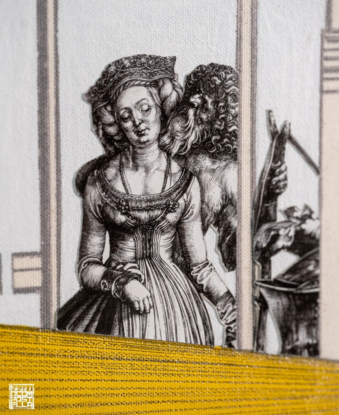 Opera del progetto “URBAN” (2021): stampa su tela di un’acciaieria dismessa decorata con raggi colorati, elementi di Dürer e omaggio a Goethe, con cornice in metallo.