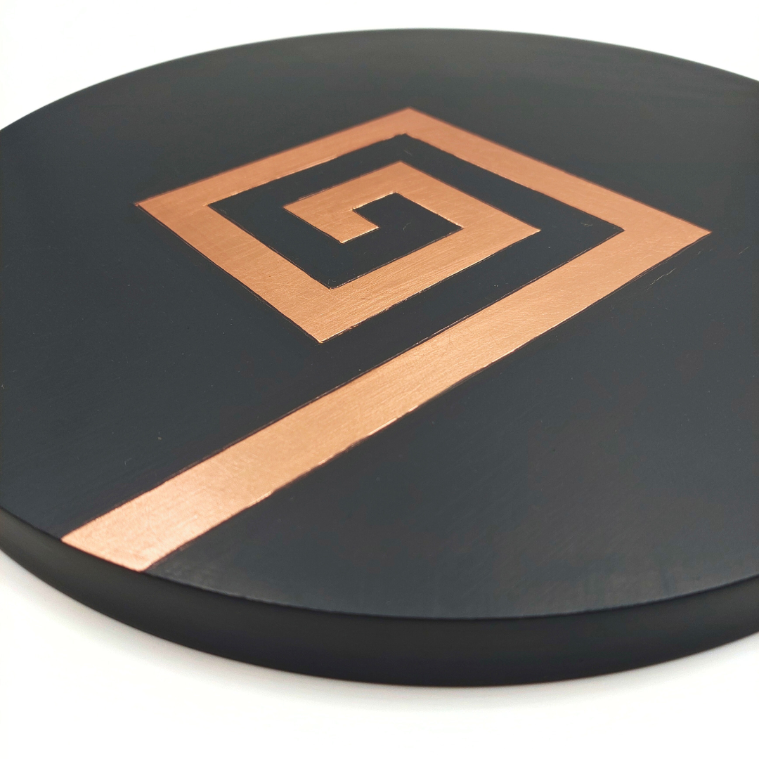 Il segno dell’Ariete, simbolo di energia e passione, rappresentato come un labirinto inciso e decorato con rame a foglia e nero materico. Un pezzo unico dalla collezione zodiacale con elementi geometrizzanti.