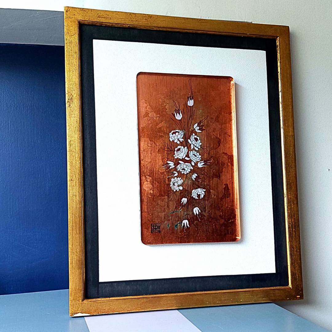 Il quadro Bouquet Rame è una decorazione floreale digitale unica, che evoca il fascino di antichi decori veneziani. Realizzato a partire da disegni originali della ditta Arte Compostella, questo quadro mescola sapientemente tradizione e modernità. L’immagine è stampata su un plexiglass da 1 cm, che le conferisce lucentezza e profondità. Il retro è decorato con una preziosa foglia di rame, rifinita con tocchi di bianco a pennello, creando un suggestivo contrasto. Il pannello in plexiglass è inserito su una base di legno, decorata in bianco e nero, e racchiuso in un passe-partout antico di legno dorato, che aggiunge un tocco di autentico fascino retrò. Questa decorazione nasce dal dialogo tra materiali diversi: la brillantezza del plexiglass, l’usura e la patina del passe-partout e l’ossido del rame a foglia. Ideale per arricchire con un tocco di raffinatezza e unicità i tuoi ambienti più eleganti.