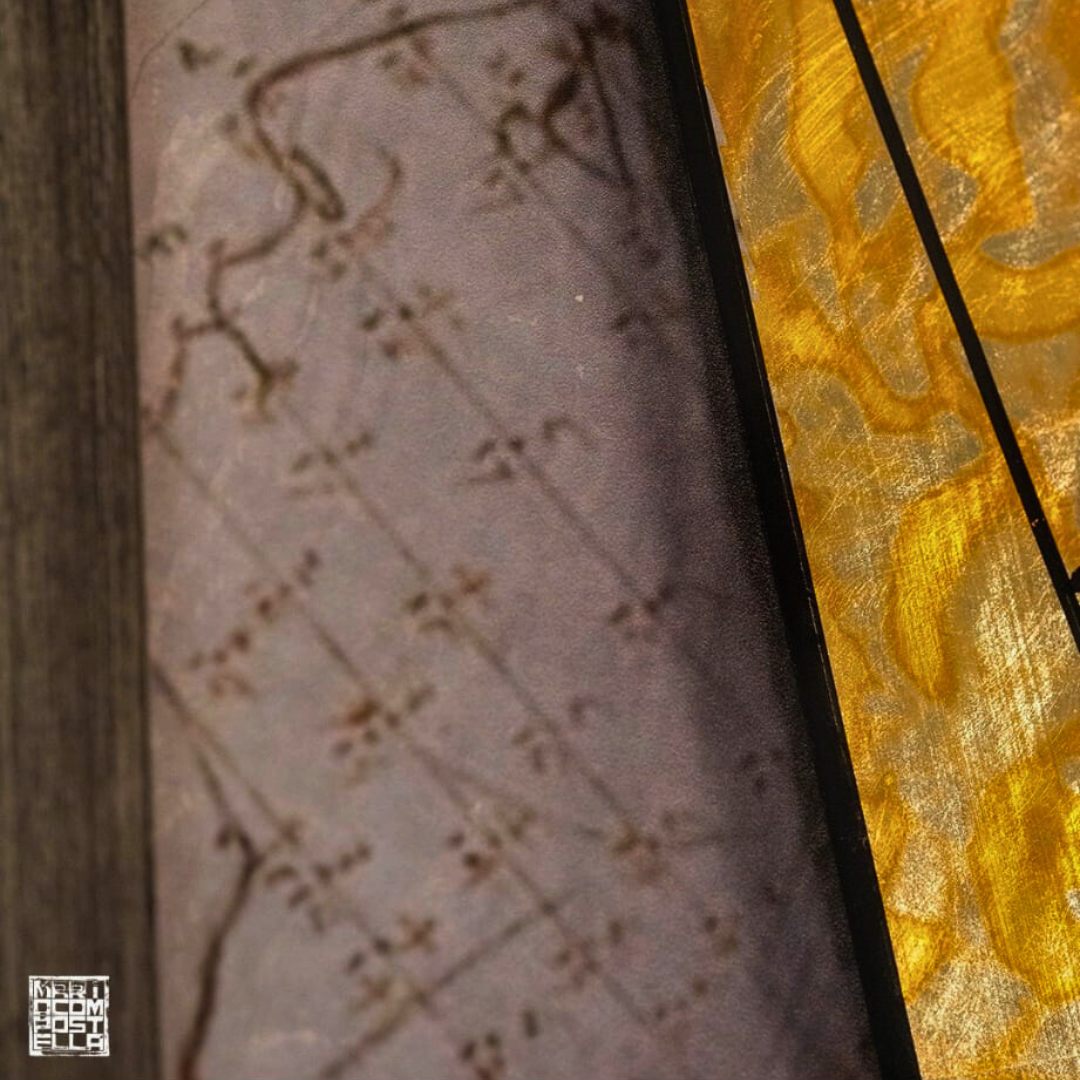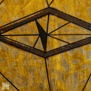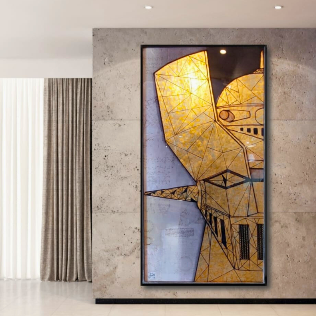 Il volto del robot è stampato su plexiglass, successivamente rifinito a mano. La decorazione in rame a foglia è applicata con metodi tradizionali, aggiungendo eleganza e calore all’opera. L’intera composizione è completata da una cornice in legno.