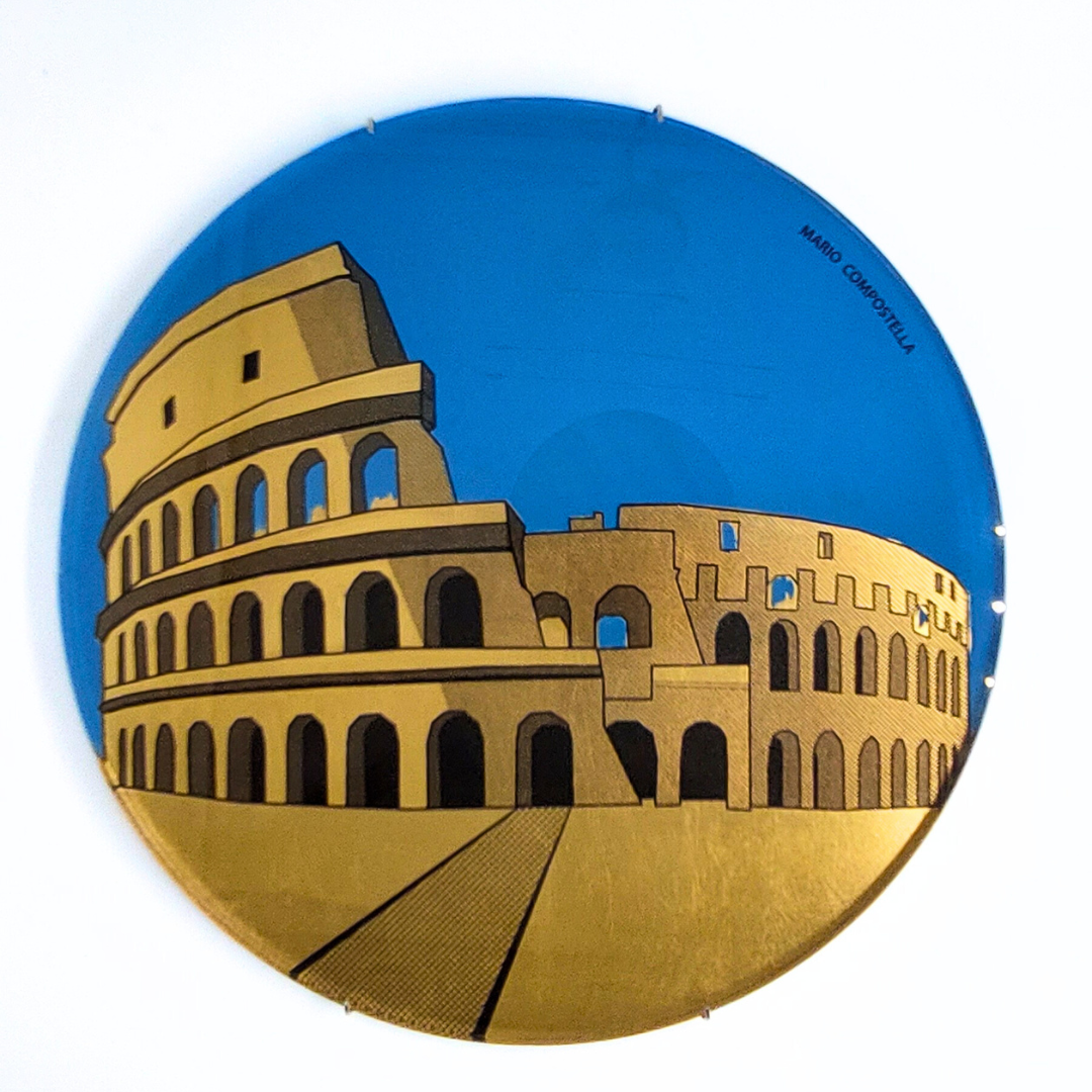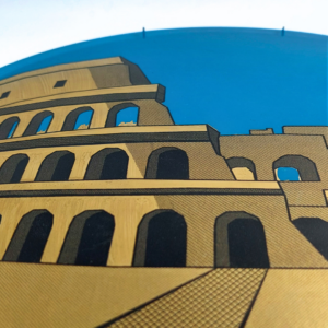 Opera del progetto “Città d’Italia” che fonde tecniche tradizionali e moderne: stampa digitale geometrica e minimale del Colosseo su plexiglass, decorata a mano con doratura a foglia.