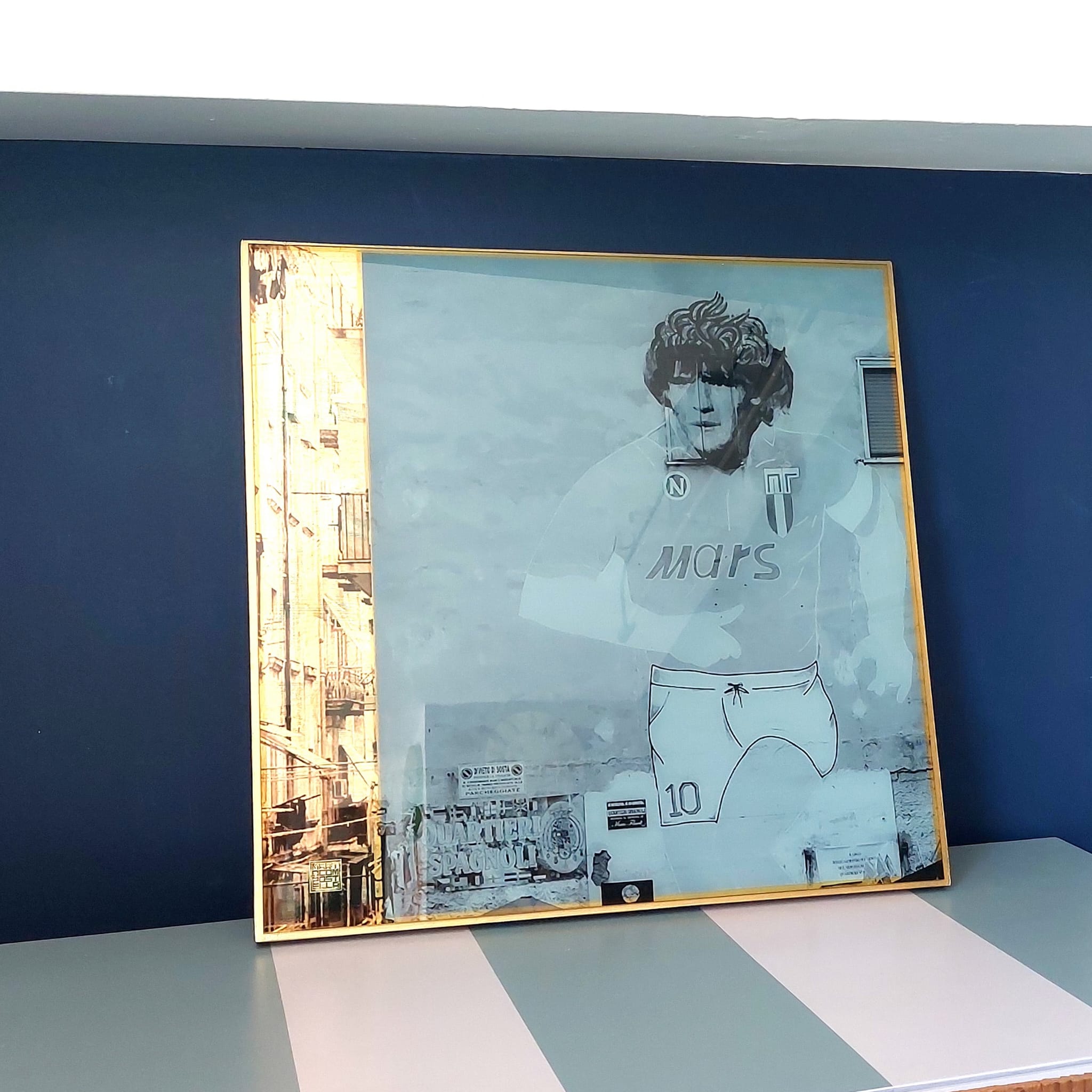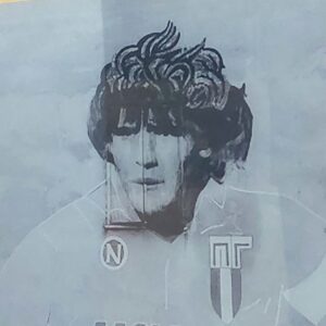 Con quest’opera ho voluto rendere un omaggio a Diego Armando Maradona, ispirato al famoso murales di Napoli. Ho stampato il suo volto su plexiglass e l’ho impreziosito con doratura a foglia e ritocchi in colori ad acqua, unendo tradizione e modernità in una tecnica mista per celebrare il mito del “Pibe de Oro”.