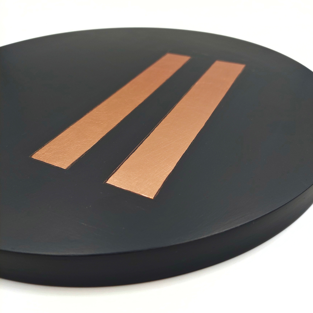 I Gemelli, segno d’aria che influenza i nati tra il 21 maggio e il 20 giugno, trovano qui una rappresentazione astratta ma eloquente: due parallelepipedi che simboleggiano la loro natura duplice e la loro innata capacità di connessione. La decorazione in rame a foglia esalta le forme geometriche, creando un contrasto sofisticato con il nero materico.