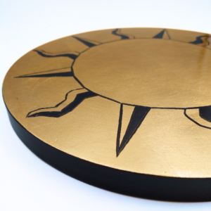 Quest’opera cattura l’essenza di Apollo, divinità solare, attraverso una potente immagine geometrica. Il sole è concepito come un grande scudo di energia, emanante forza e vitalità. Dodici raggi, incisi a mano con precisione, si irradiano dal centro, creando un dinamico alternarsi di nero profondo e oro luminoso. L’oro a foglia, elemento centrale della composizione, simboleggia la luce, la vita e lo splendore.