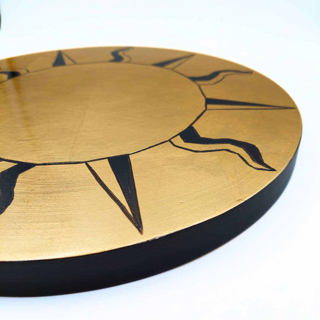 Rappresentazione stilizzata del sole come un potente scudo di energia, con 12 raggi incisi a mano che alternano il nero all’oro splendente.