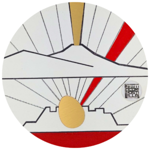 Opera su tela raffigurante l’uovo cosmico dorato con una raggiera da cui esplodono molteplici raggi rosso fuoco, simbolo di energia e vitalità, con bordo nero dipinto a mano.