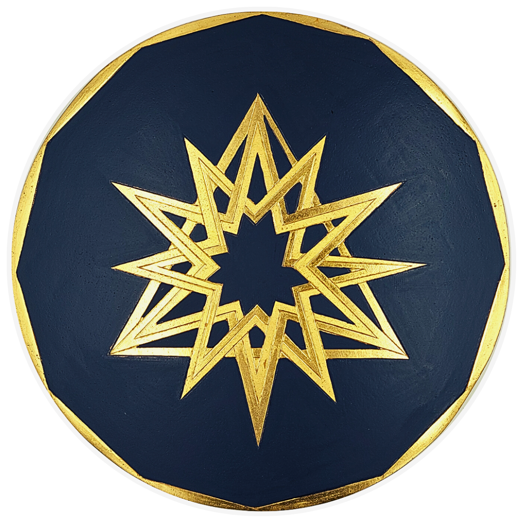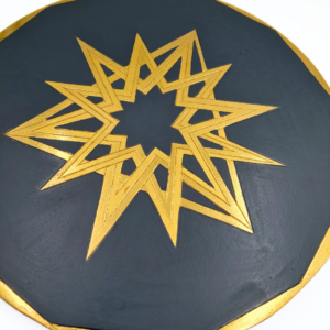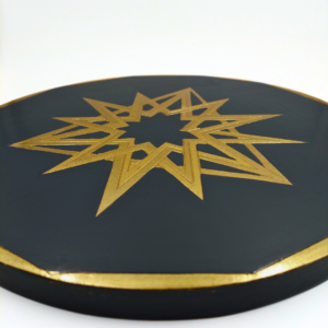 Quest’opera circolare esplora le interconnessioni geometriche attraverso l’incastro di due stelle a sei punte e un triangolo, che insieme danno vita a una nuova e affascinante geometria. Gli elementi sono rivestiti in prezioso oro a foglia 22 carati, con un ricercato contrasto tra finiture lucide e opache che ne esalta la tridimensionalità. Il fondo è laccato di un nero intenso, che fa risaltare la luminosità dell’oro e la precisione delle forme incise.