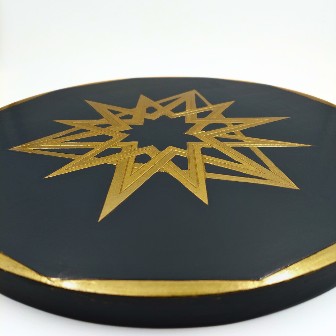 Cerchio decorato con figure geometriche (due stelle a sei punte e un triangolo) incastrate a creare una nuova forma, rivestite in oro 22 carati con effetti lucido e matto su fondo laccato nero.