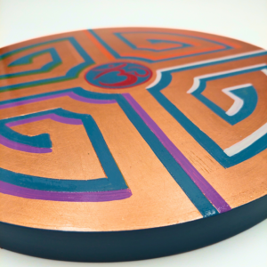 Questo mandala sacro raffigura l’OM, il suono primordiale dell’universo, con un design che cattura l’occhio e l’anima. L’intero disco è rivestito in rame a foglia, su cui è inciso un affascinante labirinto formato da quattro raggi che creano un effetto rotatorio. Al centro della composizione, un cerchio blu intenso custodisce il sacro OM, decorato con un vibrante rosso. I colori utilizzati per questa decorazione interamente manuale sono stati appositamente creati per esaltare la potenza di questo simbolo.