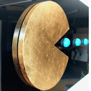 Questo quadro è un vero e proprio tributo a PAC-MAN, il leggendario eroe dei videogiochi degli anni ’80. L’opera combina sapientemente diversi materiali e tecniche per creare un pezzo unico e di grande impatto visivo. Il cuore del quadro è il disco dorato a foglia, un elemento prezioso che risplende su una superficie specchiante di colore nero, simbolo del labirinto. I pallini blu, disposti con cura, sembrano essere in procinto di essere divorati, richiamando l’azione frenetica del gioco. L’uso di materiali a contrasto è la chiave di questo pezzo: la doratura artistica a foglia, con la sua eleganza classica, si fonde con la modernità lucida del plexiglass. Questo binomio crea un effetto visivo che cattura l’attenzione. Il tutto è montato su una base in multistrato, con bordi colorati di un blu vivace che riprende i pallini, aggiungendo un ulteriore tocco di design. Quest’opera è perfetta per essere esposta in vari contesti, dalle sale da gioco ai saloni, dai corridoi di strutture ricettive a spazi privati che desiderano un tocco di arte e stile retrò. È più di un semplice quadro: è un pezzo di storia del videogioco, pronto a decorare e a raccontare una storia.