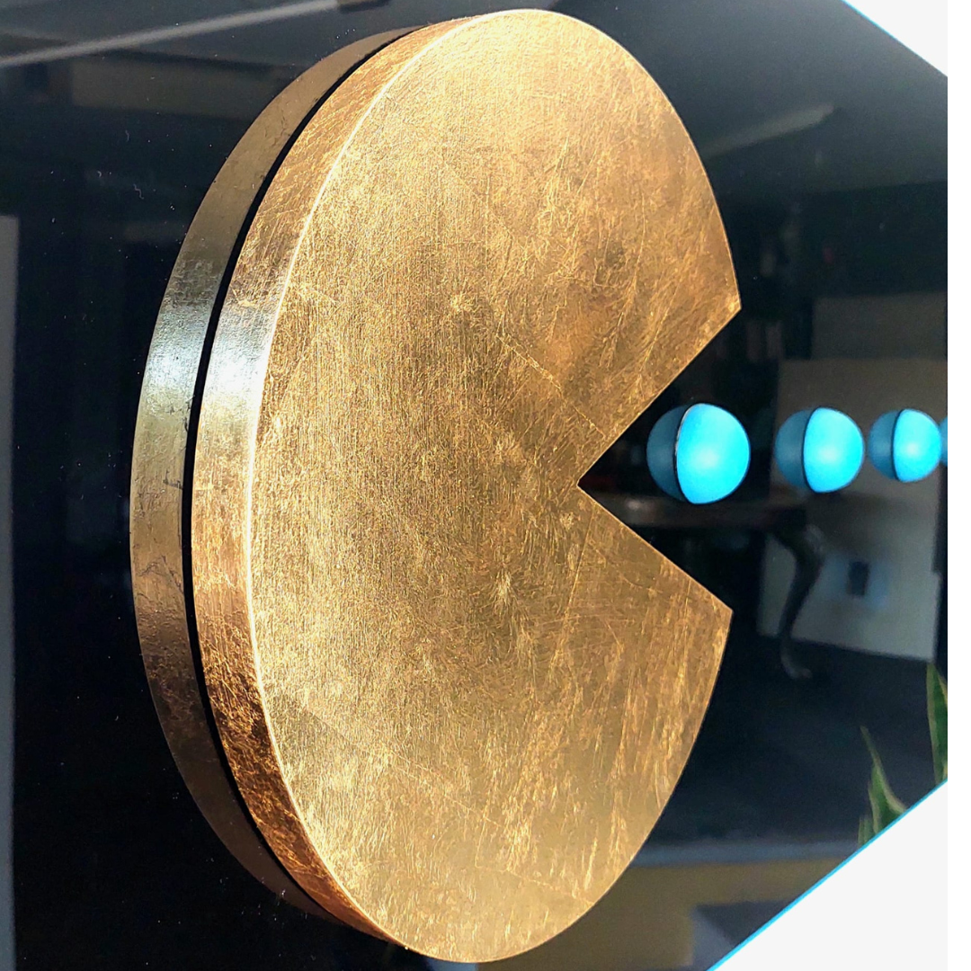 Un’opera unica che celebra l’icona dei videogiochi anni ’80, PAC-MAN, attraverso un mix di materiali e tecniche. Il disco dorato a foglia, prezioso e riflettente, cattura lo sguardo su una superficie nera a specchio, creando un forte contrasto con i “pallini” blu che vengono divorati. Ideale per arricchire con stile e nostalgia qualsiasi ambiente, dal salotto alla sala giochi.
