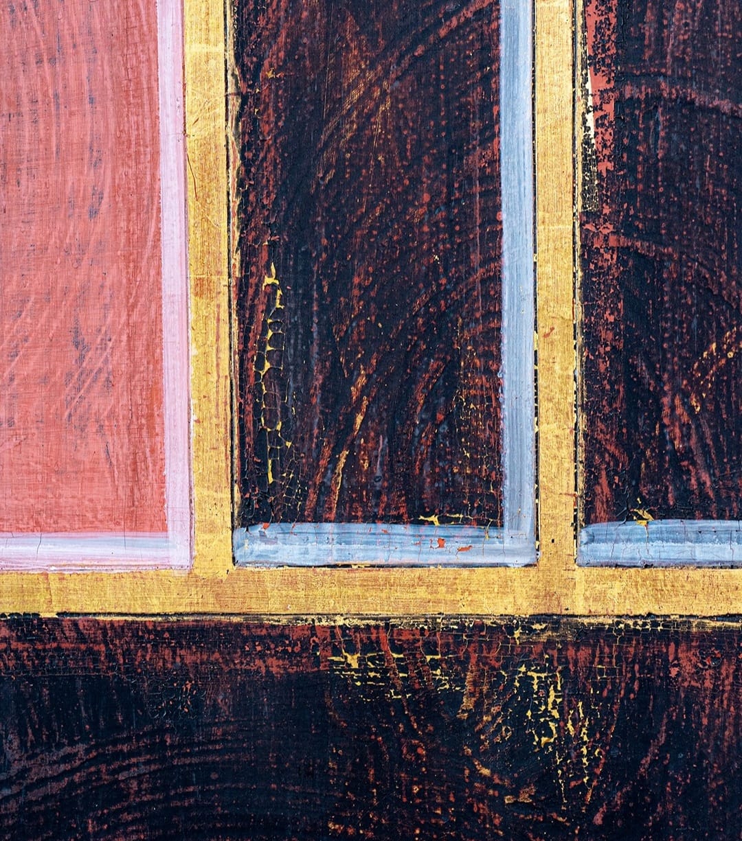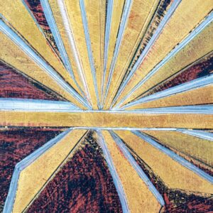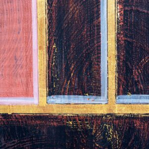 Passeggiando tra le vestigia della villa di Poppea ad Oplonti, sono rimasto affascinato dalla bellezza degli affreschi, in particolare dagli elementi vegetali che decoravano un corridoio. Quest’opera si compone di tre pannelli in legno rivestiti con malta ad effetto materico. Le incisioni definiscono una griglia geometrica, colorata con nero profondo, il caratteristico rosso pompeiano e fasce di un caldo oro. Al centro, un cespuglio stilizzato è impreziosito da oro verde e oro giallo, applicati con la raffinata tecnica a guazzo e lucidati con cura utilizzando pietre d’agata. La composizione finale evoca l’atmosfera antica e suggestiva degli affreschi di stile pompeiano.