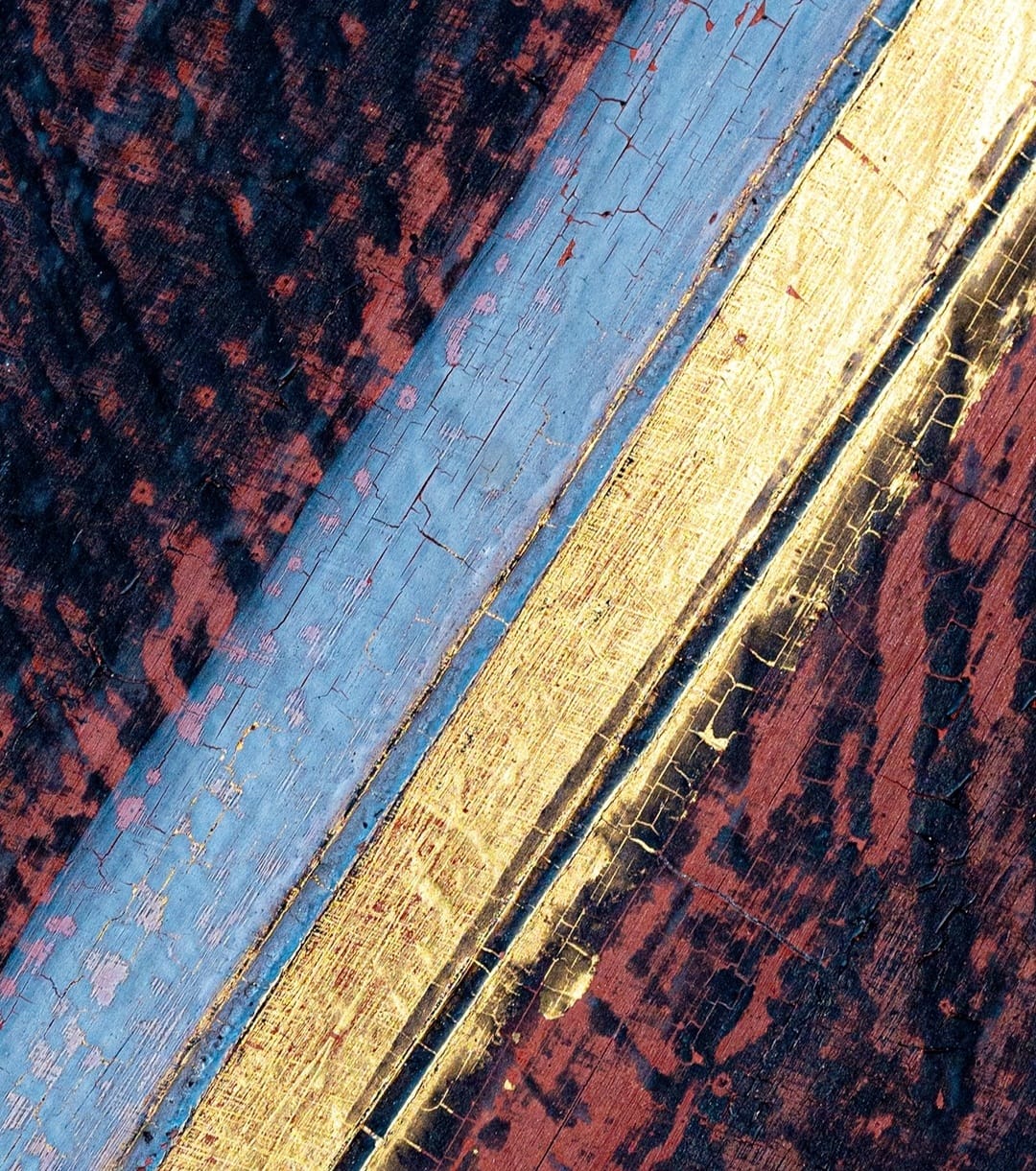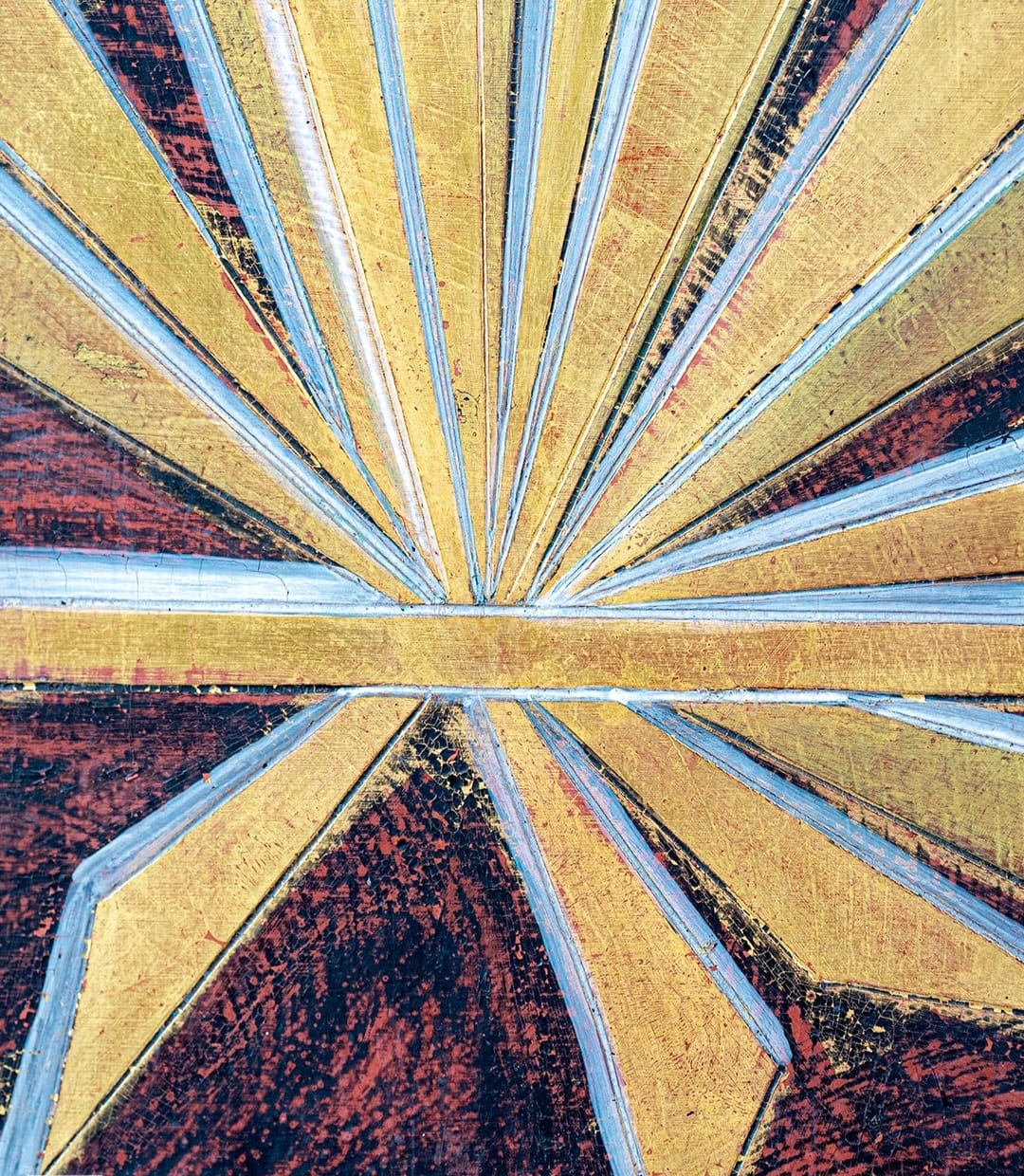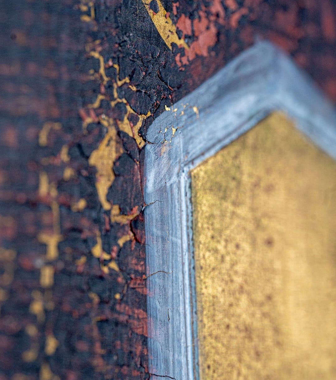 - Materiali: Oro a foglia 22 carati giallo, oro a foglia verde, gesso, argilla, colori ad acqua, resina naturale.