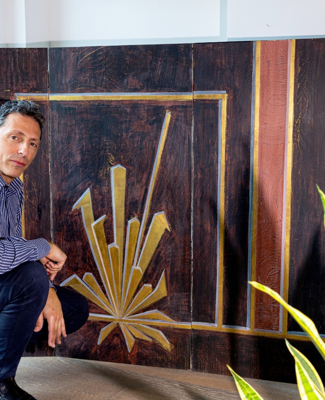 Opera su tre pannelli in legno con malta materica, griglia geometrica incisa (nero, rosso pompeiano, oro), cespuglio stilizzato in oro verde/giallo (tecnica a guazzo, lucidatura agata). Effetto anticato pompeiano.