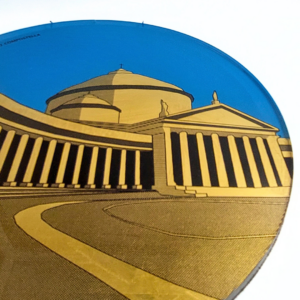 Opera del progetto “Città d’Italia” che fonde tecniche tradizionali e moderne: stampa digitale geometrica e minimale di Piazza del Plebiscito su plexiglass, decorata a mano con doratura a foglia.