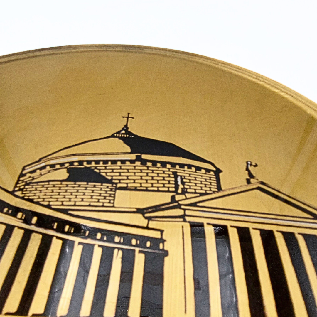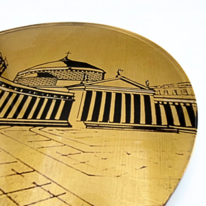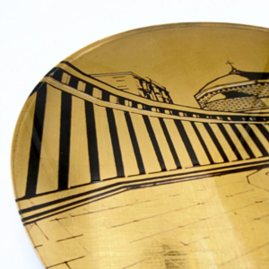 Questo progetto, intitolato “Città d’Italia”, nasce dalla volontà di unire la ricchezza delle tecniche tradizionali con l’innovazione del linguaggio moderno. Il disegno geometrico e minimale cattura l’essenza iconica di Piazza del Plebiscito. Una stampa digitale su plexiglass fa da base a una successiva decorazione manuale con preziosa doratura a foglia. La trasparenza del plexiglass, unita alla brillantezza metallica, conferisce a quest’opera una luminosità e una preziosità sorprendenti.