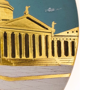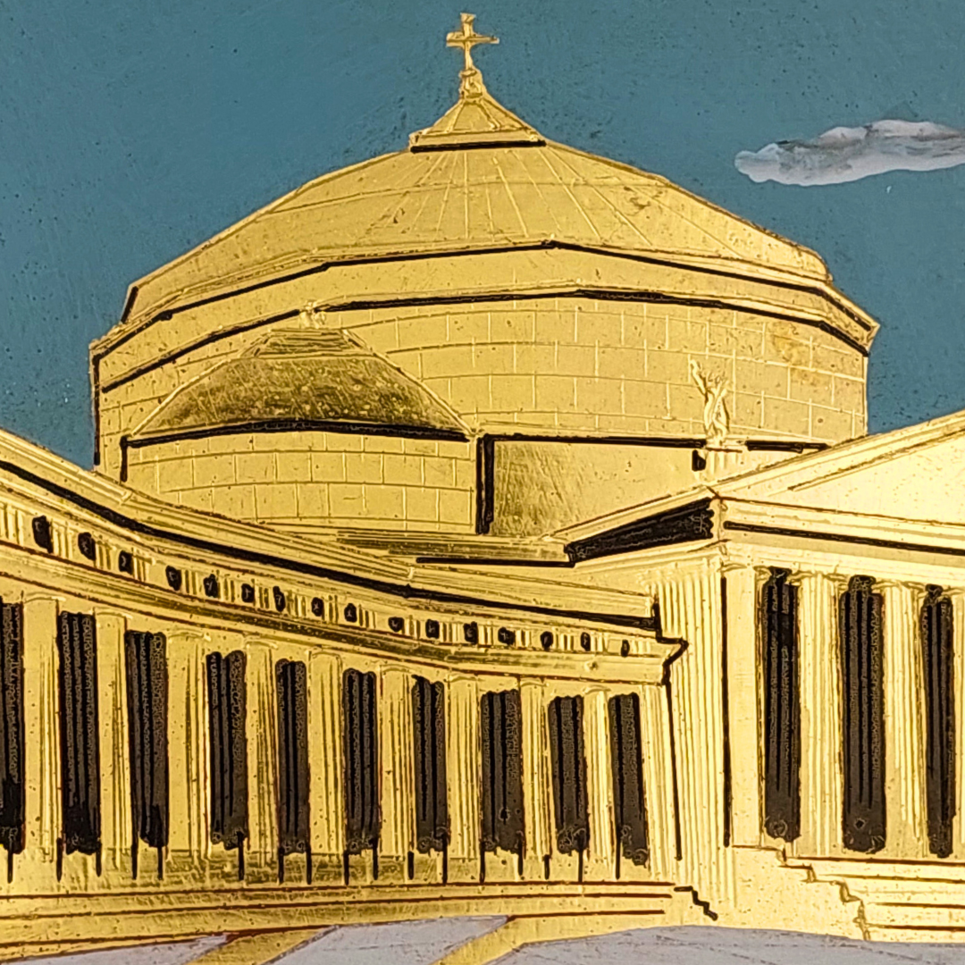 Quadro che raffigura la Basilica di San Francesco da Paola e il colonnato di Piazza del Plebiscito con tecniche di doratura a guazzo, incisione e lucidatura manuale in oro 22 carati.
