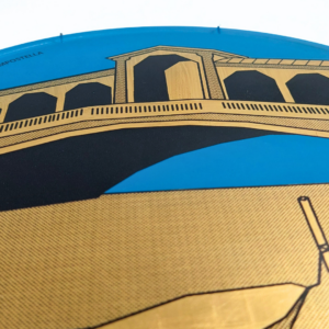 Questo progetto, intitolato “Città d’Italia”, nasce dalla volontà di unire la ricchezza delle tecniche tradizionali con l’innovazione del linguaggio moderno. Il disegno geometrico e minimale cattura l’essenza iconica del Ponte di Rialto. Una stampa digitale su plexiglass fa da base a una successiva decorazione manuale con preziosa doratura a foglia. La trasparenza del plexiglass, unita alla brillantezza metallica, conferisce a quest’opera una luminosità e una preziosità sorprendenti.