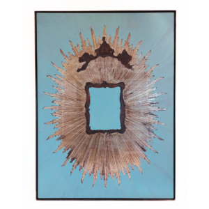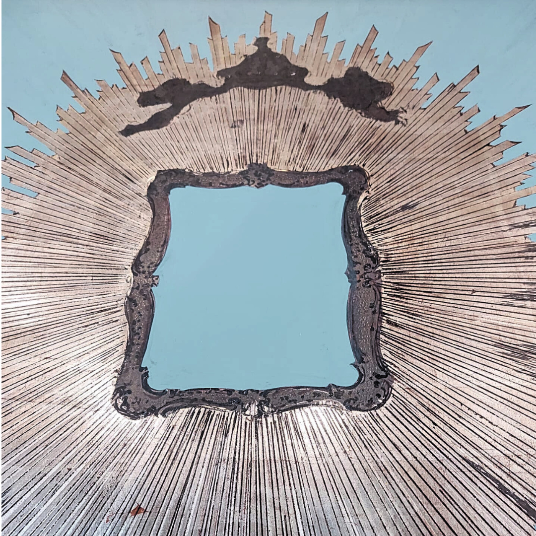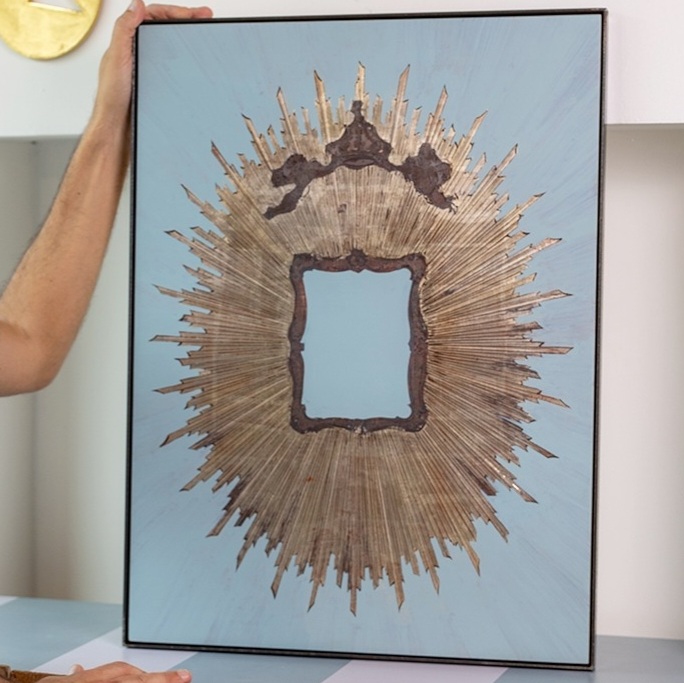 Questa splendida raggiera è una creazione originale proveniente dallo storico archivio “Arte Compostella”. La sua decorazione è realizzata con pregiato argento a foglia, applicato con la tecnica della doratura a guazzo su un delicato fondo azzurro. Il cuore della composizione presenta due angeli che sorreggono una corona, simbolo di gloria e protezione. La cornice posta nella parte inferiore è pensata per ospitare un’immagine a scelta, rendendo quest’opera altamente personalizzabile e adatta a diverse esigenze devozionali o decorative.
