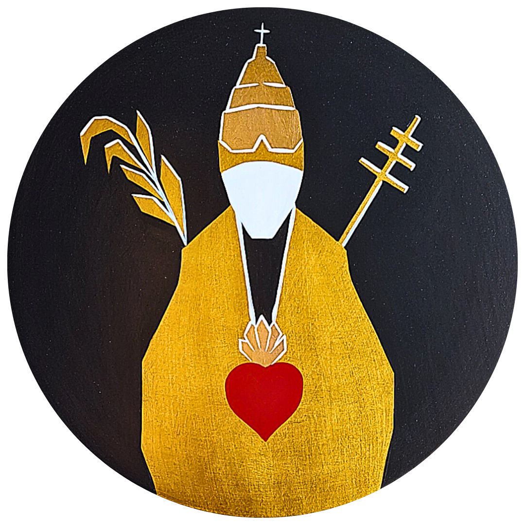 Icona circolare di San Silverio, Papa e santo patrono dell’isola di Ponza, realizzata con foglie d’oro e colori ad acqua. Un omaggio artistico al protettore dell’isola.