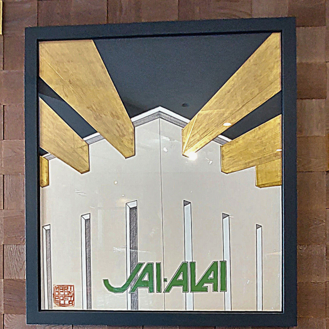 “Sferisterio” fa parte del progetto “URBAN” del 2021, volto a mostrare edifici dismessi sotto una nuova luce. Sulla tela è stampato un disegno dello sferisterio su un fondo nero intenso. Dalla struttura si proiettano verso l’esterno una serie di raggi dorati a rilievo, realizzati con oro a foglia 22 carati di doppio spessore e prima qualità, decorati con elementi geometrici ottenuti dalla lucidatura con pietre d’agata. Al centro spicca la scritta “jai alai”, che rimanda all’origine basca del gioco della pelota. L’opera è completata da una cornice in ferro.