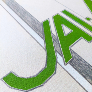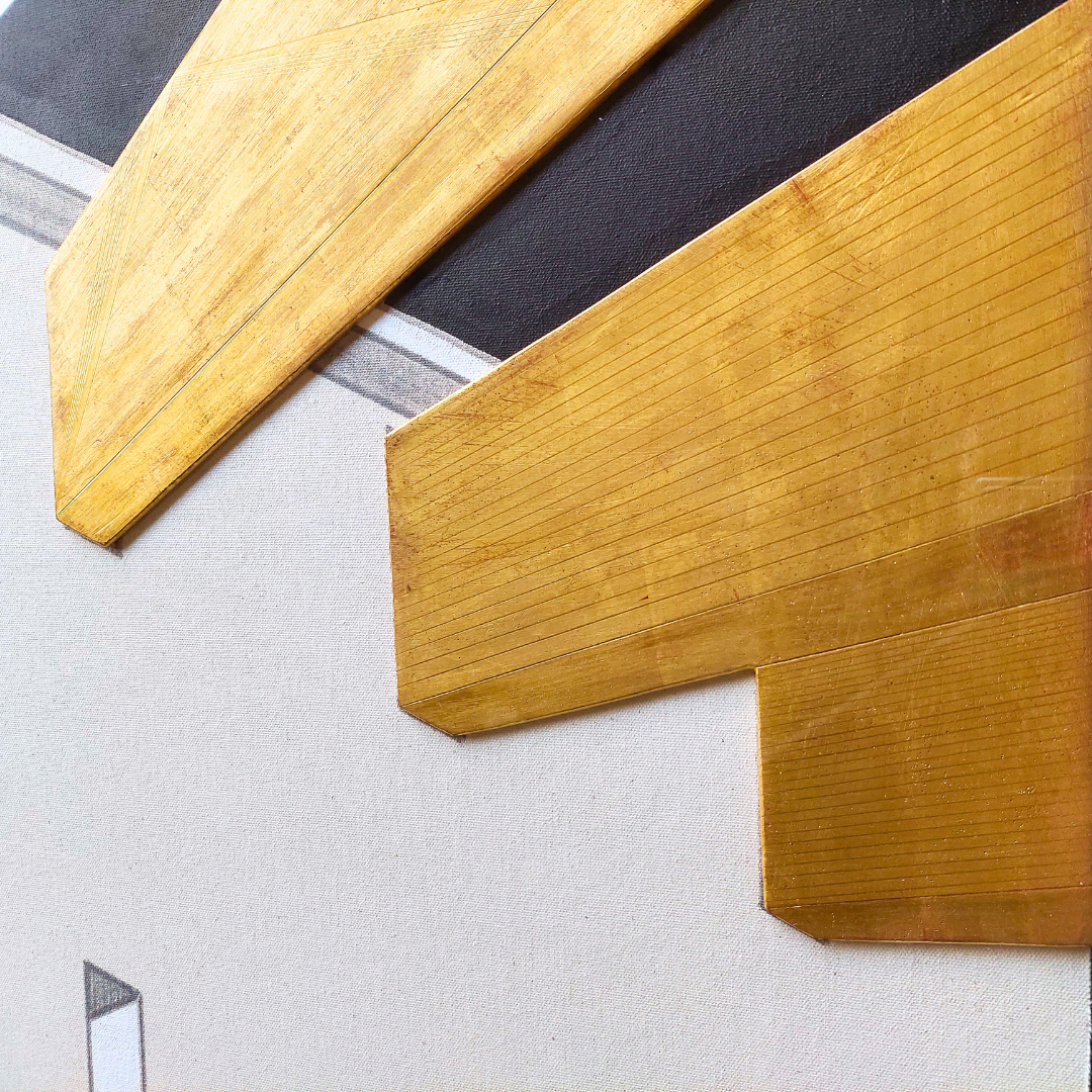Opera del progetto “URBAN” (2021): stampa su tela di uno sferisterio su fondo nero con raggi dorati a rilievo (oro 22 carati, lucidatura agata), scritta “jai alai”.