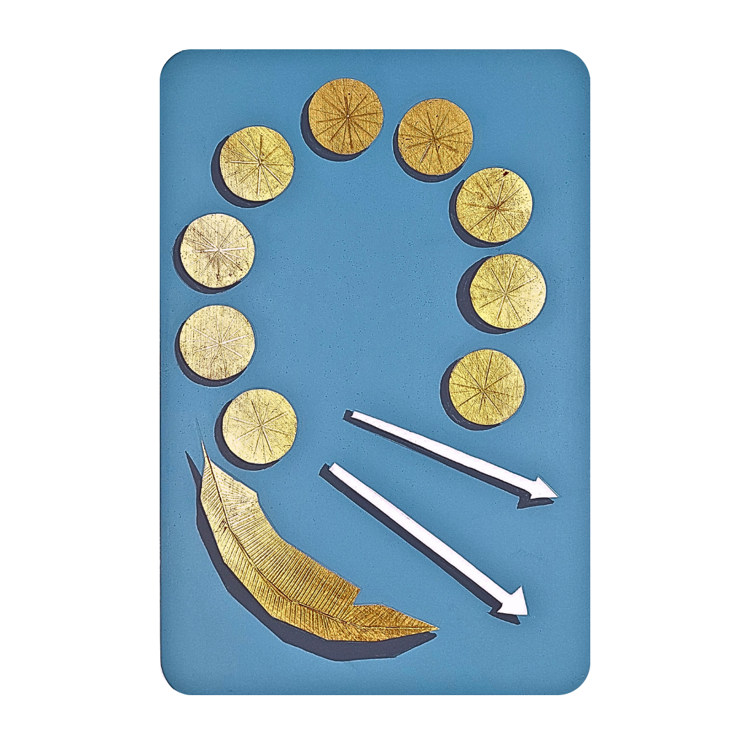 Questa formella è un tributo alla mitica sirena Partenope, figura fondatrice di Napoli, raffigurata con elementi simbolici antichi che ne evocano l’essenza. Le nove stelle, che richiamano la costellazione della Vergine, la piuma, simbolo della sua natura volatile, e le due frecce, elemento di dualità, sono realizzati in prezioso oro a foglia 22 carati e impreziositi da una meticolosa lucidatura manuale che ne esalta la brillantezza. Il colore di fondo azzurro fa risaltare la luminosità dell’oro.