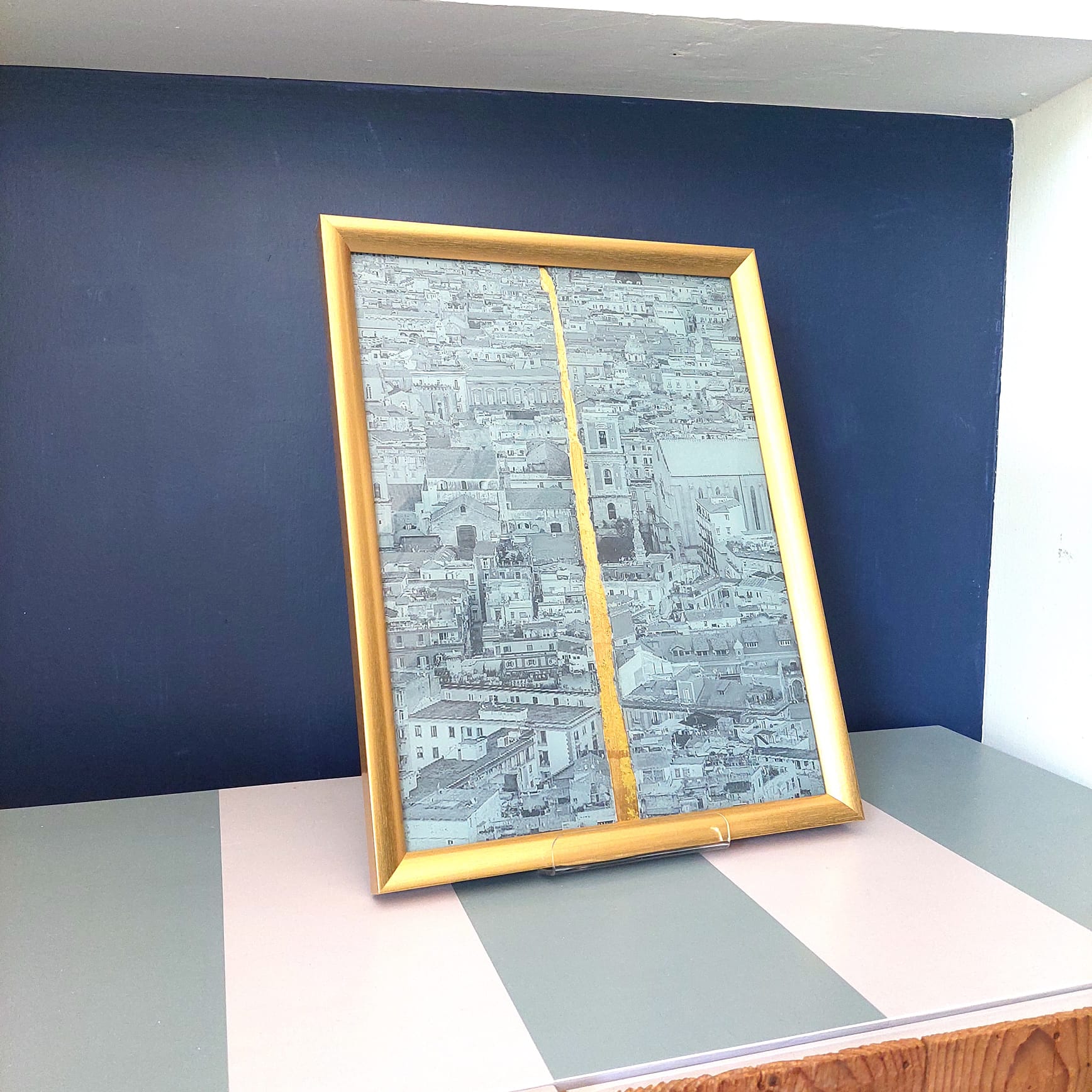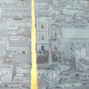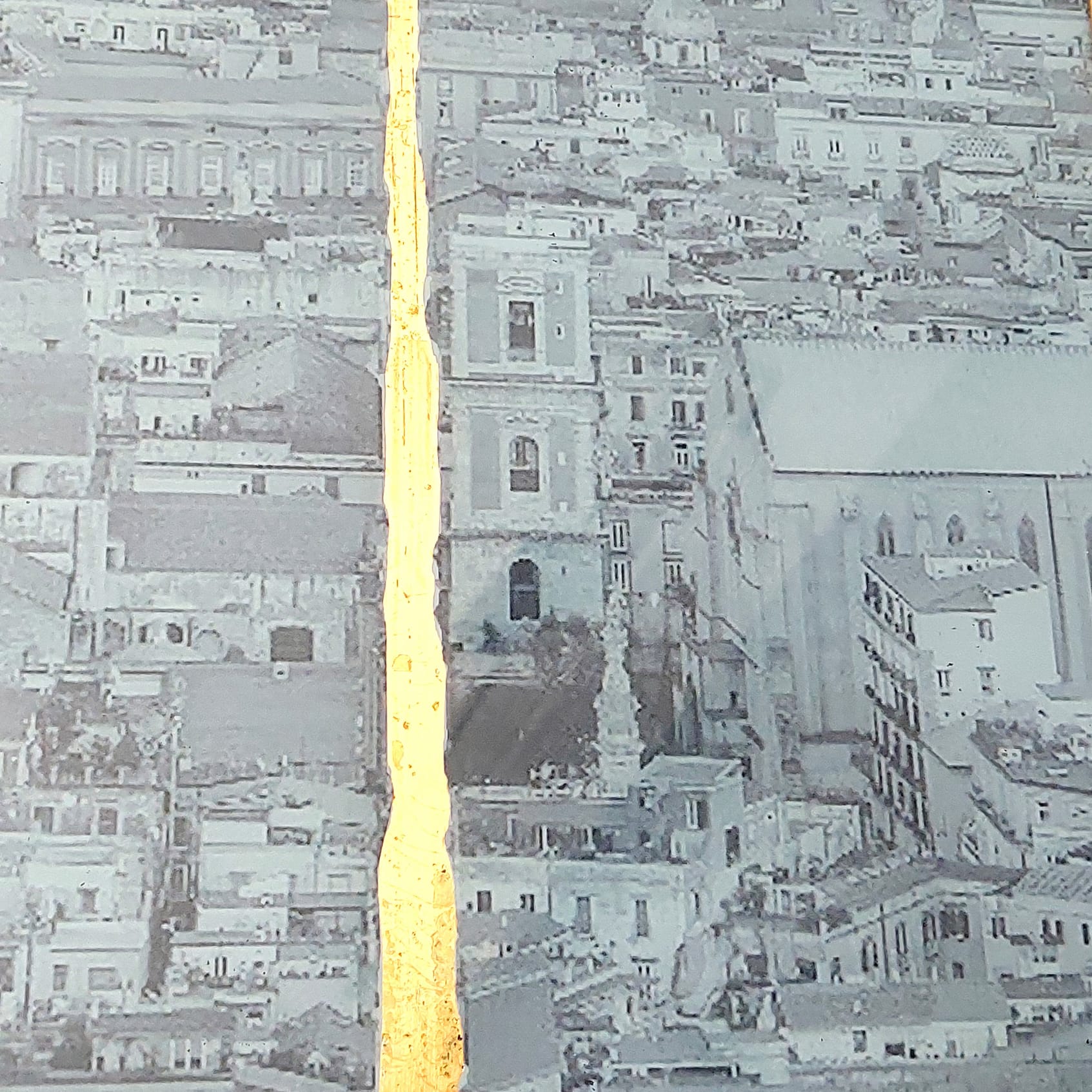 E’ una stampa su plexiglass che celebra l’antica e iconica strada di Napoli, la Spaccanapoli, che divide storicamente la città in due. L’opera è stata impreziosita con una tecnica mista che la rende unica e preziosa. L’immagine è stata rifinita a mano rivestendola con una sottile foglia d’oro che cattura, aggiungendo un tocco di lussuosa preziosità. Le decorazioni sono state realizzate con colori ad acqua laccati, stesi a pennello, che creano un contrasto vibrante e delicato con l’oro.