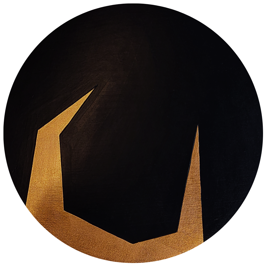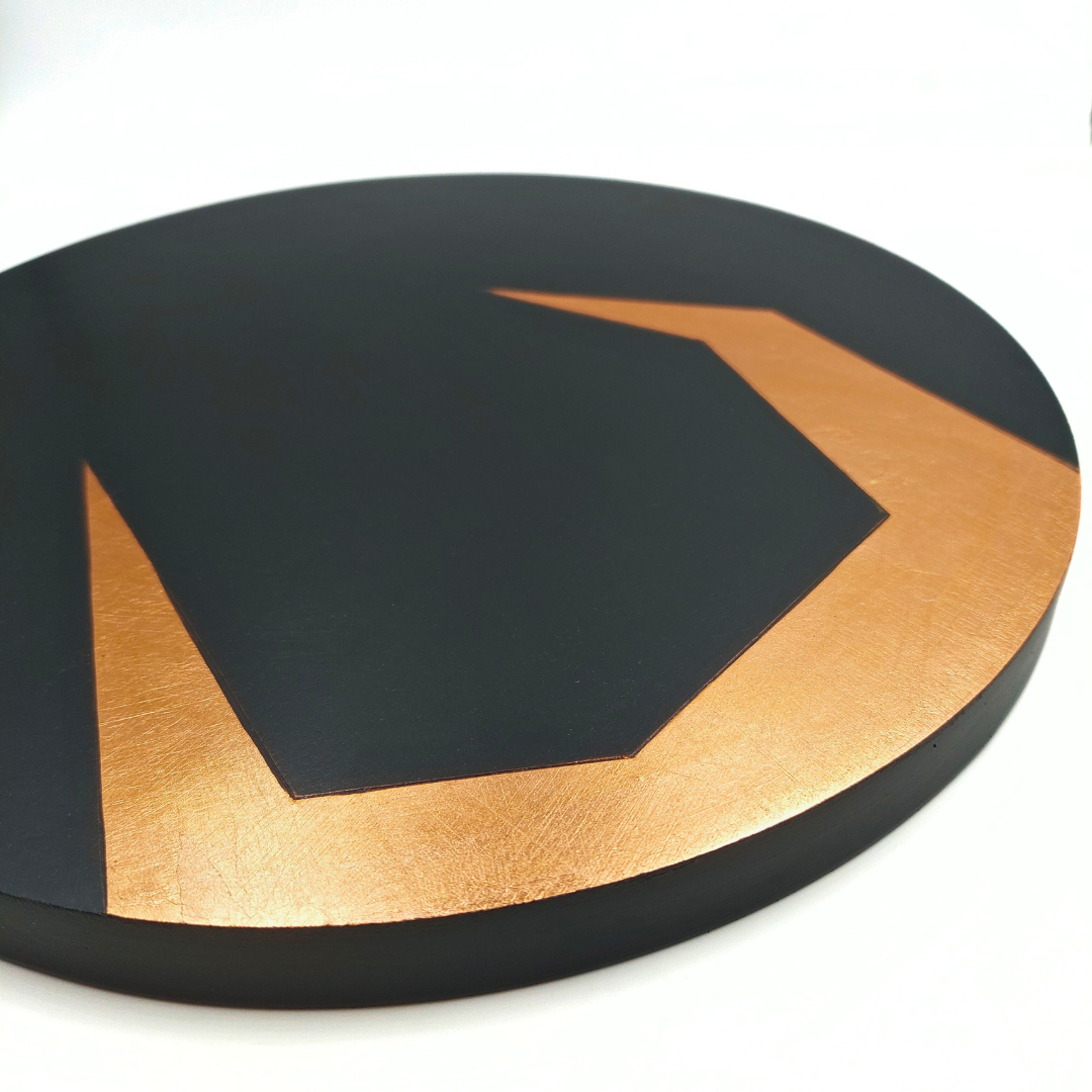 Il segno del Toro, legato alla terra e rappresentato dalla forma della falce lunare, decorato con rame a foglia e nero materico. Design geometrico unico per la collezione zodiacale.