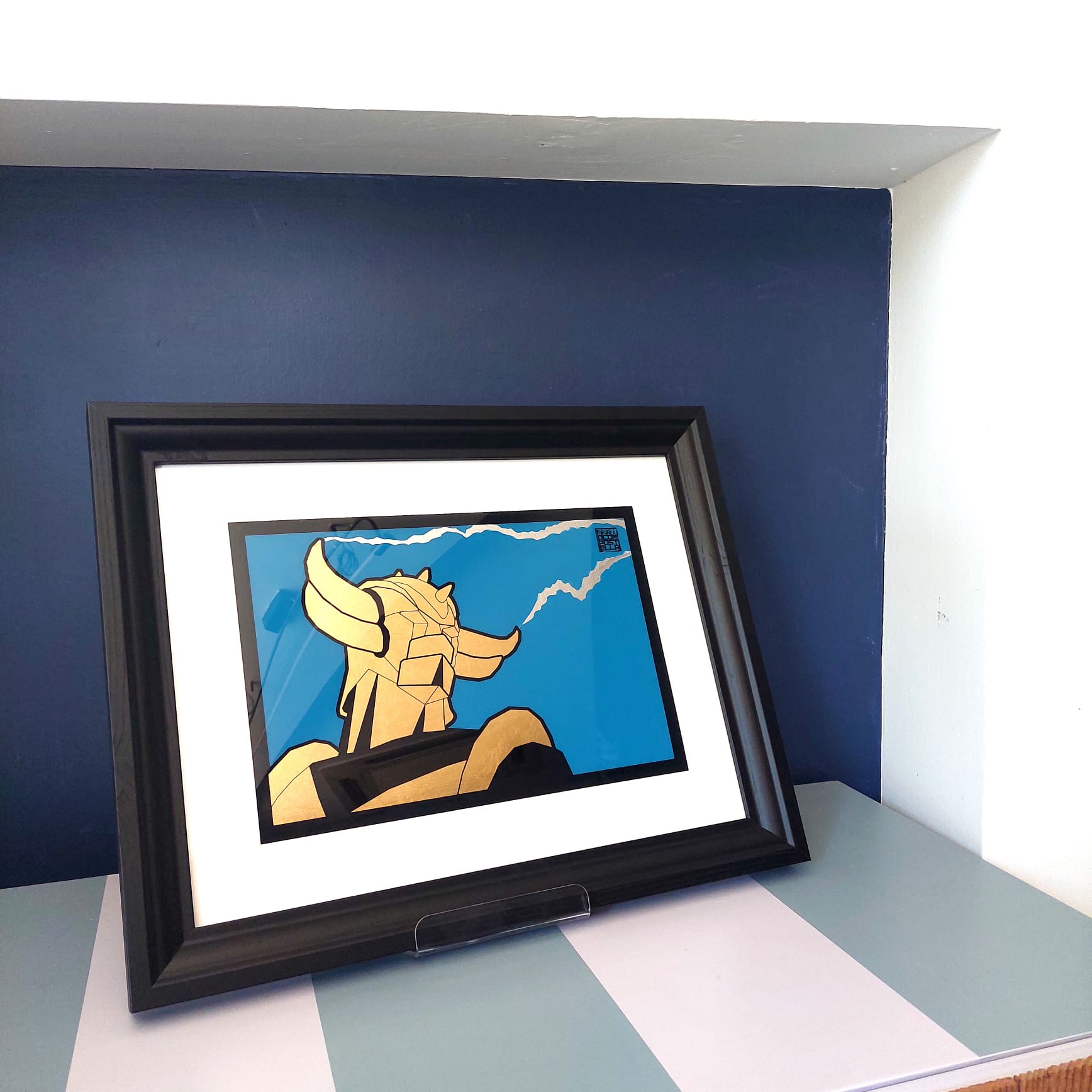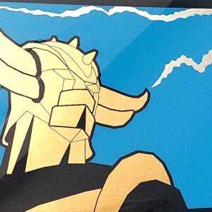 Questo piccolo e affascinante quadro è un tributo al leggendario Goldrake. La composizione è una miscela di materiali e tecniche: al centro, una stampa retro di Goldrake su plexiglass trasparente, realizzata con motivi geometrici. La figura è impreziositi da una finitura in doratura e argentatura a foglia. Il resto della superficie è decorata con blu laccato a pennello. La cornice in colore nero. Un pezzo d’arte originale, ideale per arricchire con stile e personalità qualsiasi parete, dalla zona living all’ufficio.