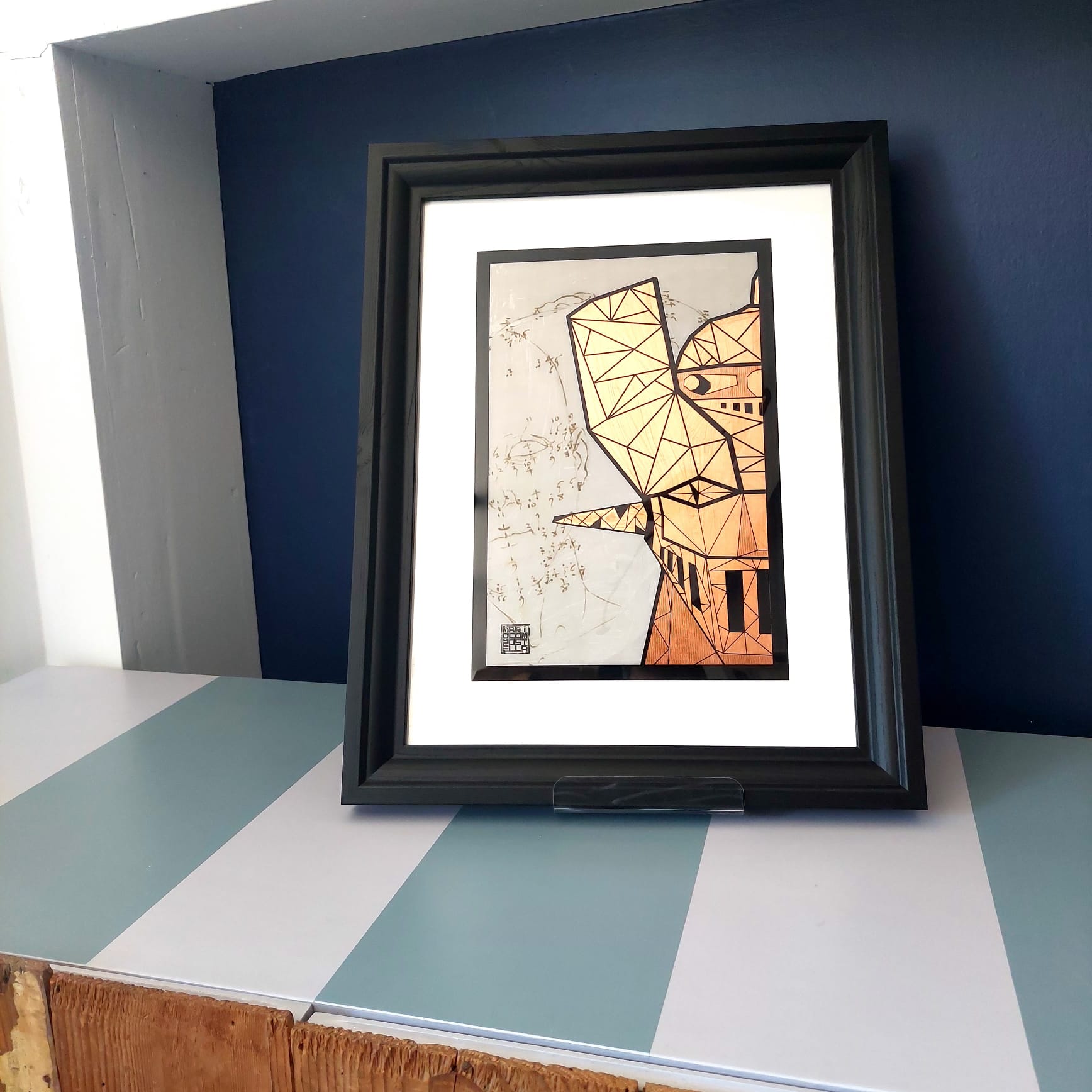 Questo piccolo e affascinante quadro è un tributo al leggendario Mazinga, rivisitato con un tocco di arte classica. La composizione è una miscela di materiali e tecniche: al centro, Mazinga su plexiglass trasparente, arricchita da motivi geometrici impreziositi da una finitura in rame a foglia, che dona una luce calda all’opera. Il resto della superficie è arricchito con carte che riproducono i disegni di Piero della Francesca, creando un contrasto affascinante tra l’eroe dei fumetti e il Rinascimento italiano. La cornice in colore nero. Un pezzo d’arte originale, ideale per arricchire con stile e personalità qualsiasi parete, dalla zona living all’ufficio.