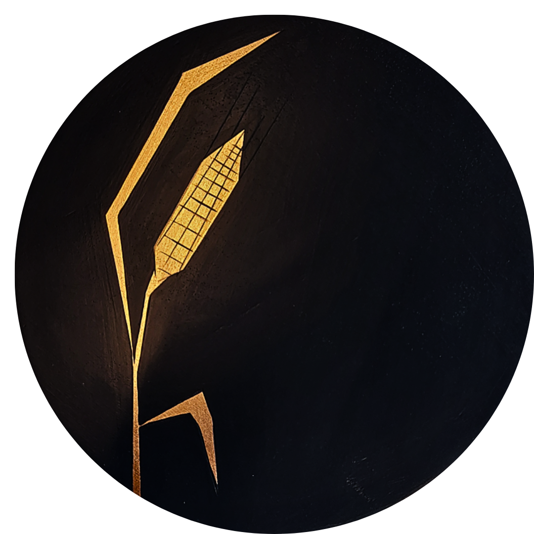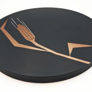 La Vergine, segno di terra che influenza i nati tra il 23 agosto e il 22 settembre, è qui omaggiata con la rappresentazione di una spiga di grano, simbolo di fertilità e prosperità fin dall’antichità. La forma stilizzata si arricchisce del contrasto tra il caldo bagliore del rame a foglia e la profondità del nero materico.